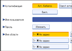Когда параметры [Аут. Kerberos], [Digest аутентификация] и [Аут. незашифр.текста] выбраны для настройки аутентификации, используйте учетное имя и пароль администратора. Не вводите учетное имя и пароль администратора для использования аутентификации для каждого отдельного лица или для каждого поиска.